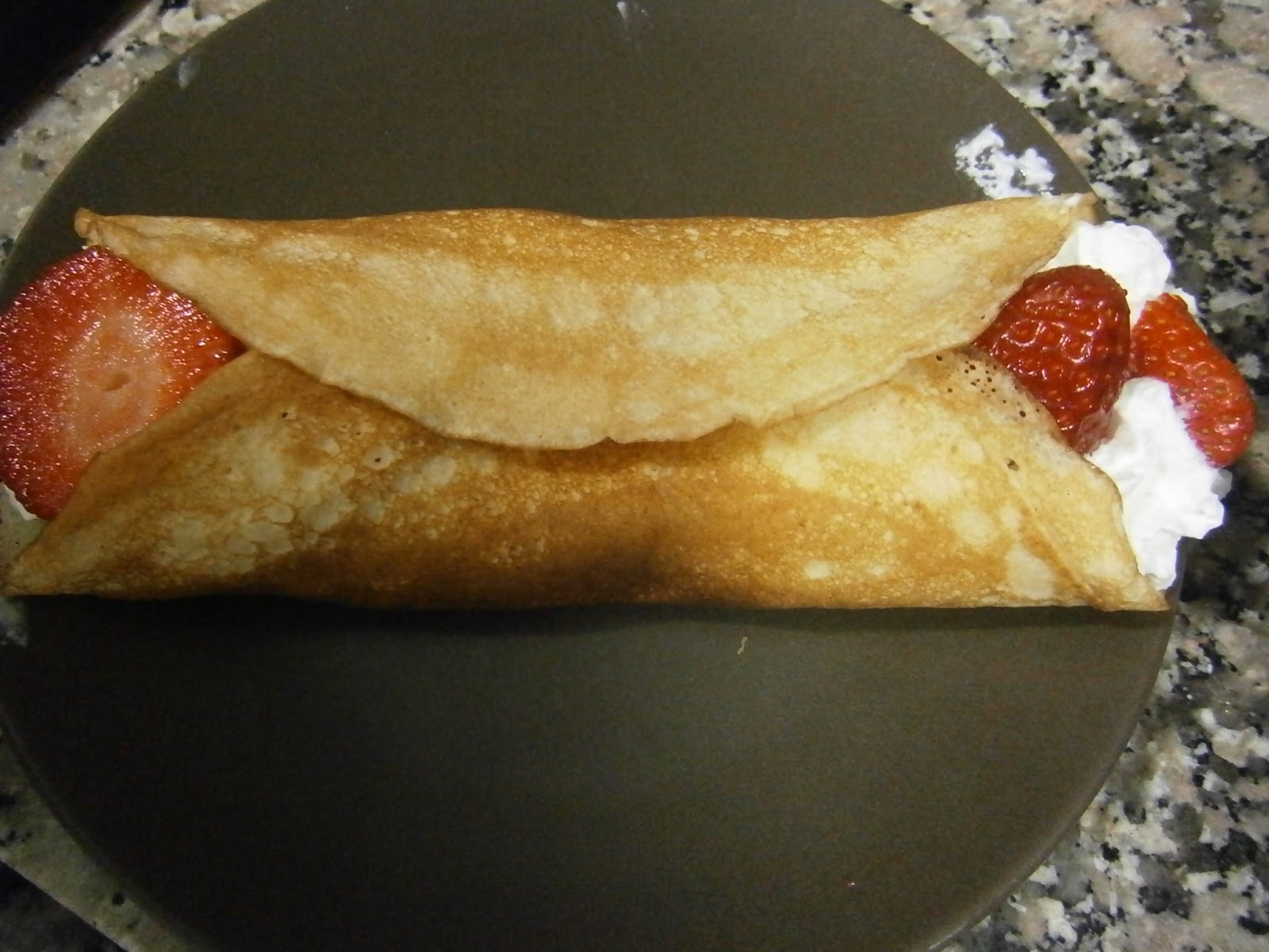 The preparation of these Strawberry and Milk Cream Crêpes is very easy... Take a crêpe, add a little bit of milk cream, some strawberries cut in slices and close it...
