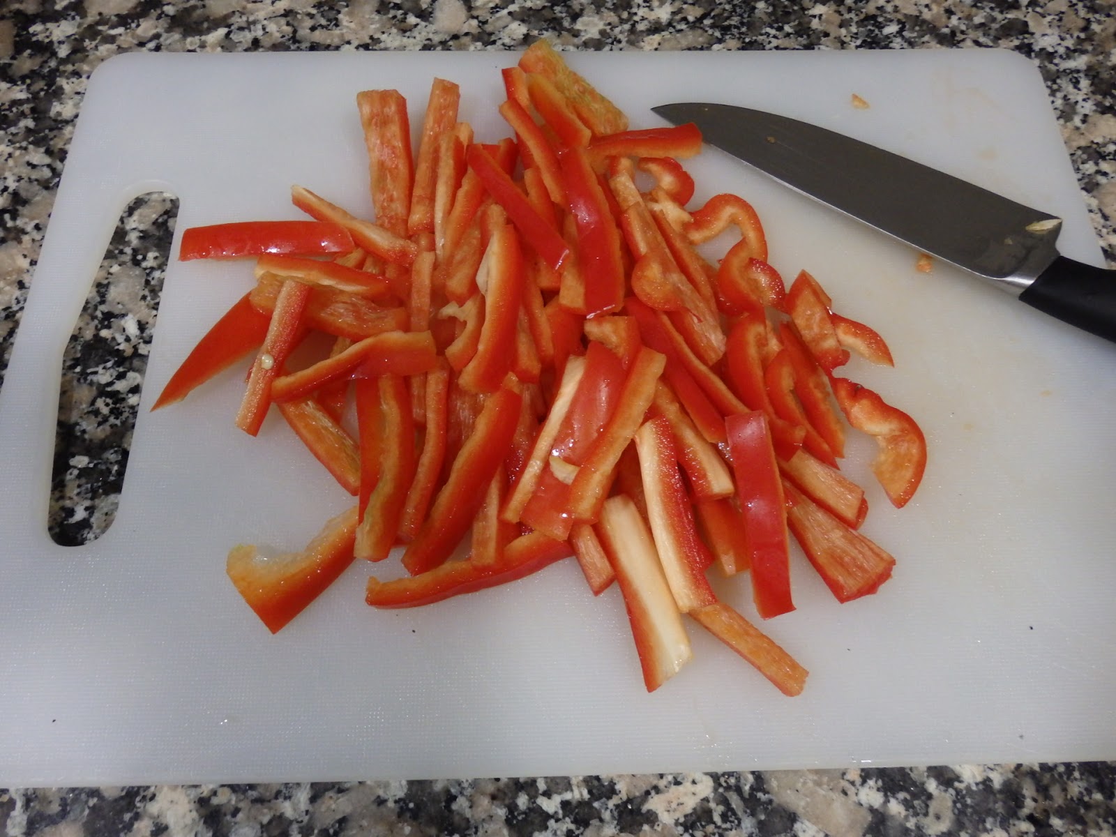 Add the vegetables (red pepper, green peppers and zucchini) cut in strips and fry them... Add a little more of salt...
