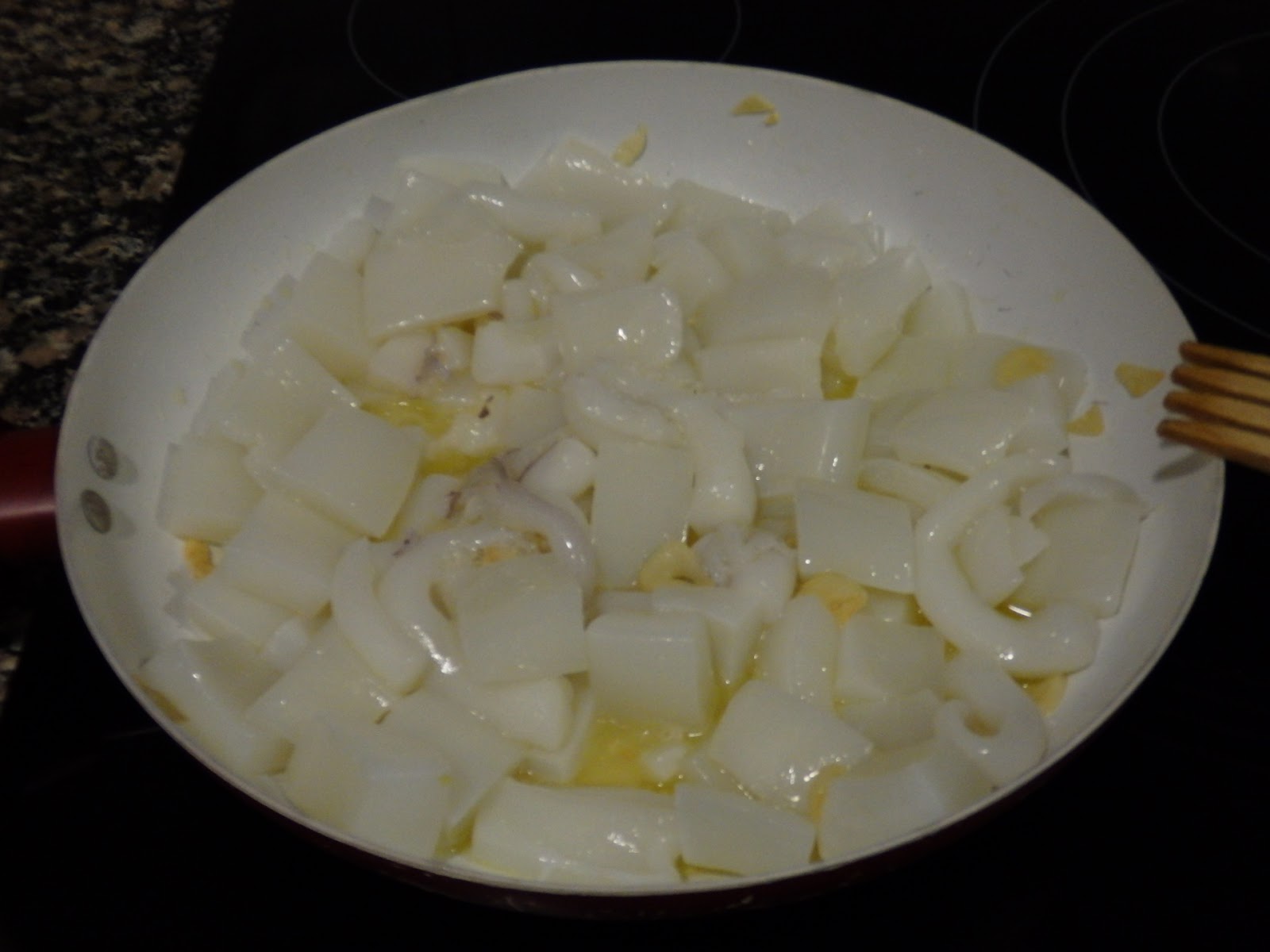 Add the cuttlefishes cut in small portions... Add salt and cook until all the water is reduced...