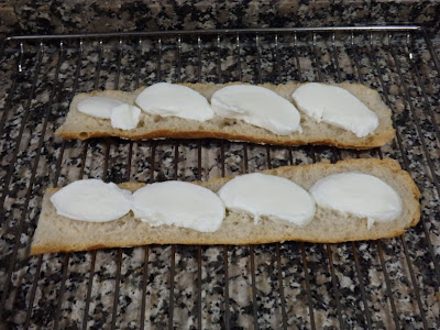 Para preparar esta sencilla bruschetta, cortamos el pan por la mitad y lo colocamos en una bandeja para el horno...