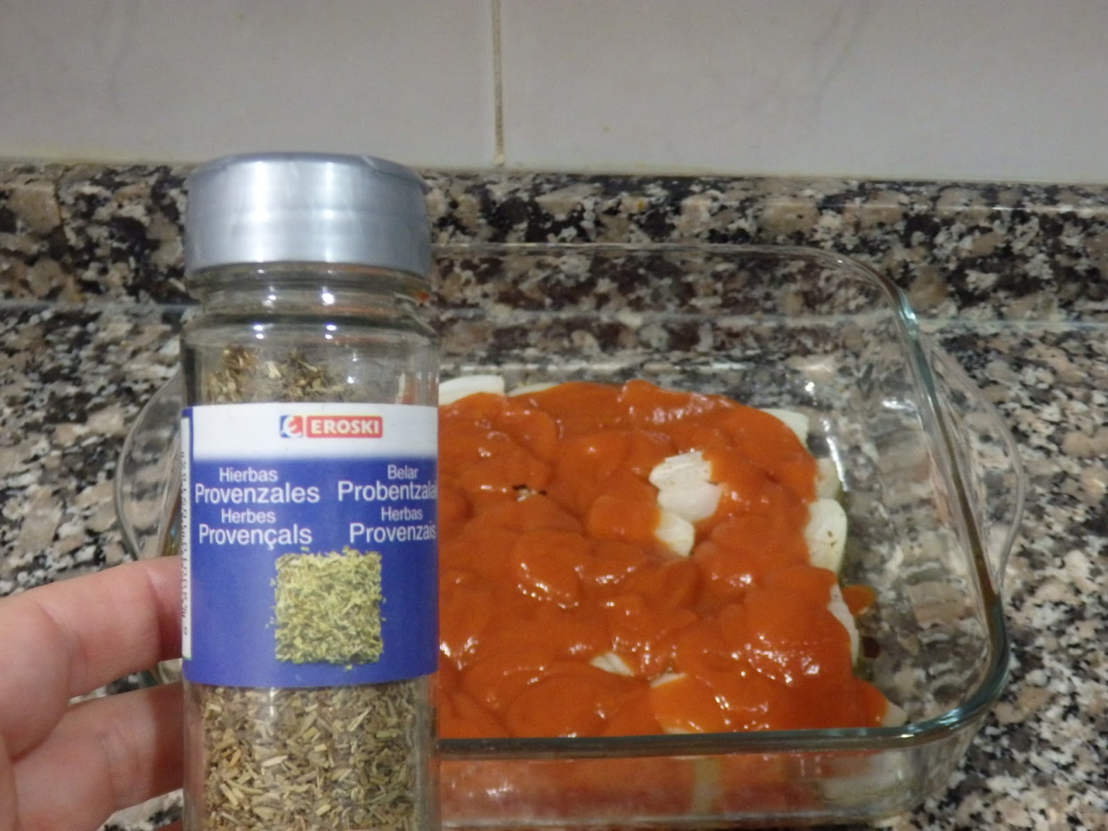 Sacar del horno y añadir la salsa de tomate con un poco de hierbas provenzales...