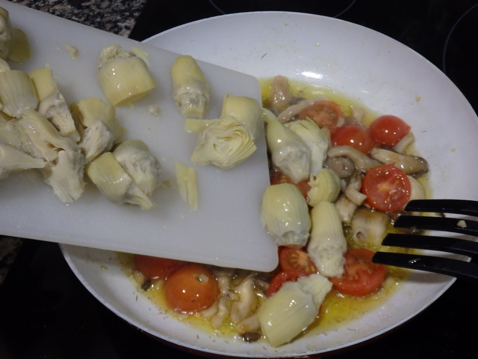 Escurrir la pasta, colocar en un plato y añadir encima las setas con los tomates y alcachofas...