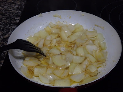 To make this recipe we begin by frying the onion cut in small portions in a pan with extra virgin olive oil... Add salt...