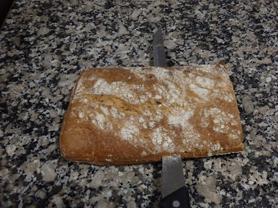 Para preparar esta sencilla bruschetta, cortamos el pan por la mitad y lo colocamos en una bandeja para el horno...
