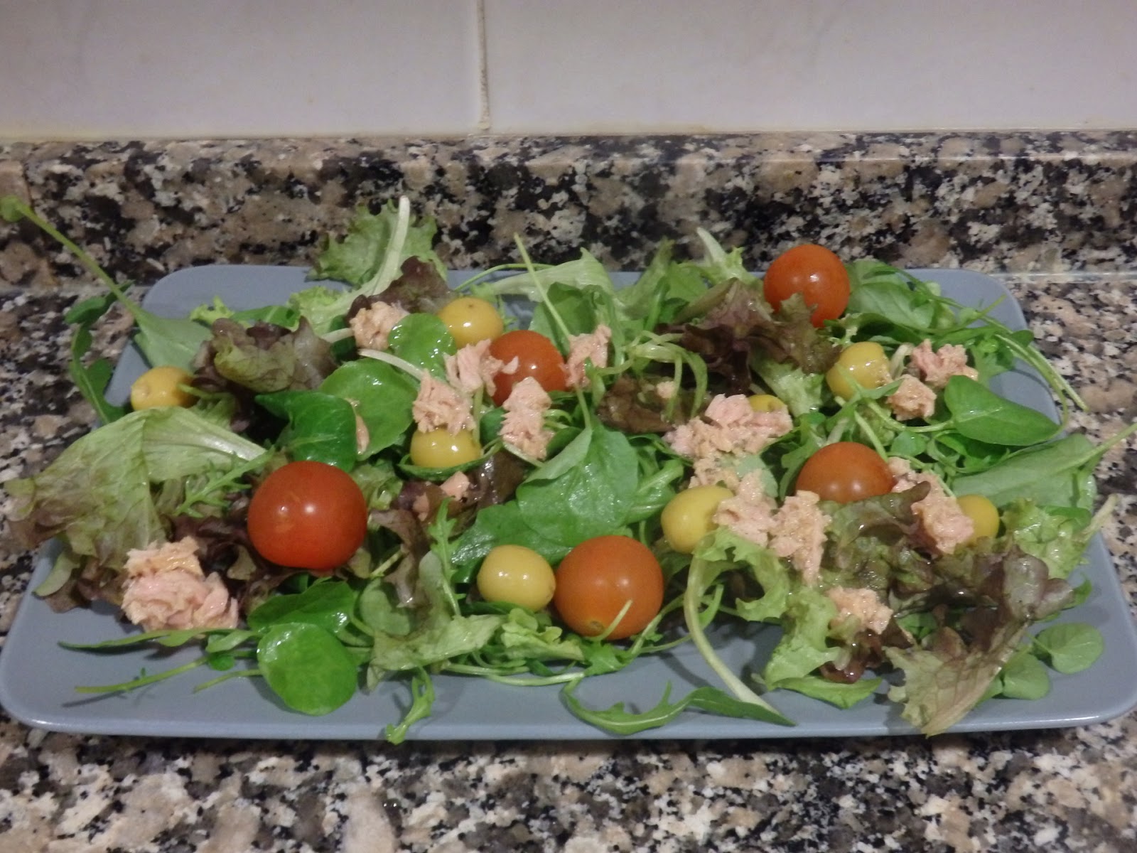 Place the salad in a plate and add the cherry tomatoes, the green olives and the tuna...