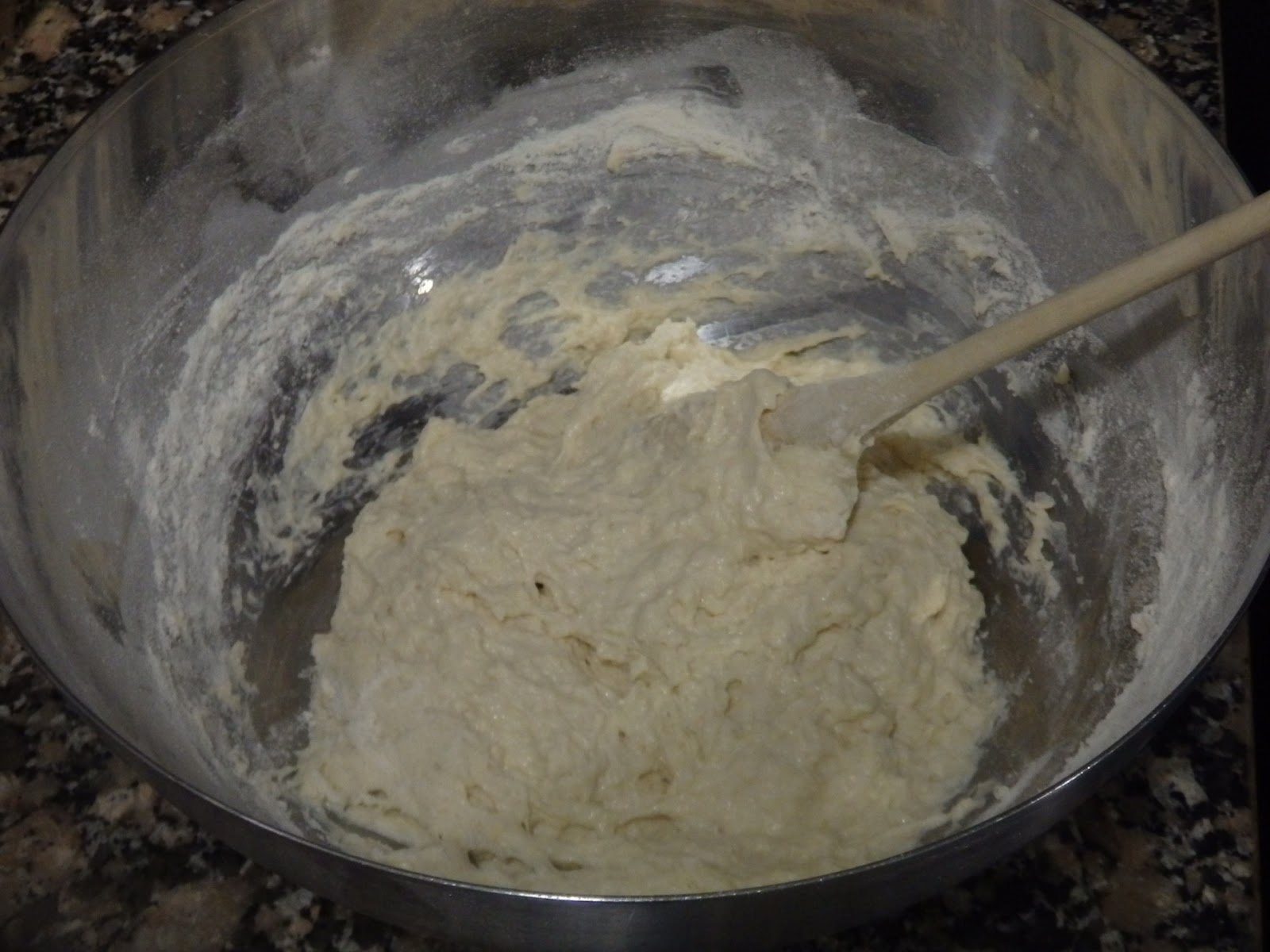 Añadir la mitad de la harina y el aceite de oliva y mezclar bien... Dejar reposar 20 minutos tapado con un trapo...