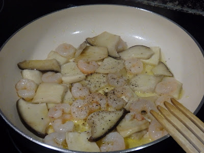 Cuando las setas estén listas, añadir las gambas, un poco de sal, pimienta negra y perejil picado y mezclar bien...