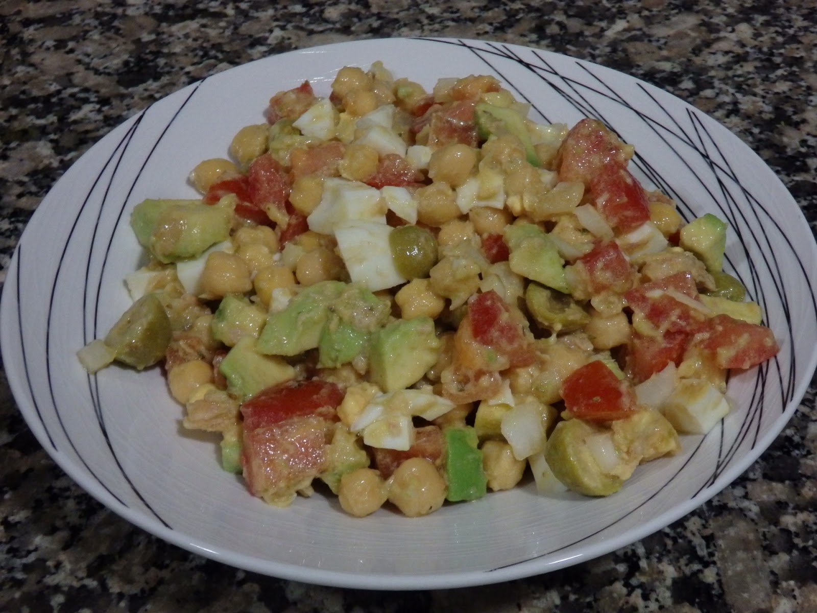 Y la Ensalada de Garbanzos, Aguacate, Tomate, Cebolla, Huevo, Atún, Olivas Verdes y Orégano está lista...