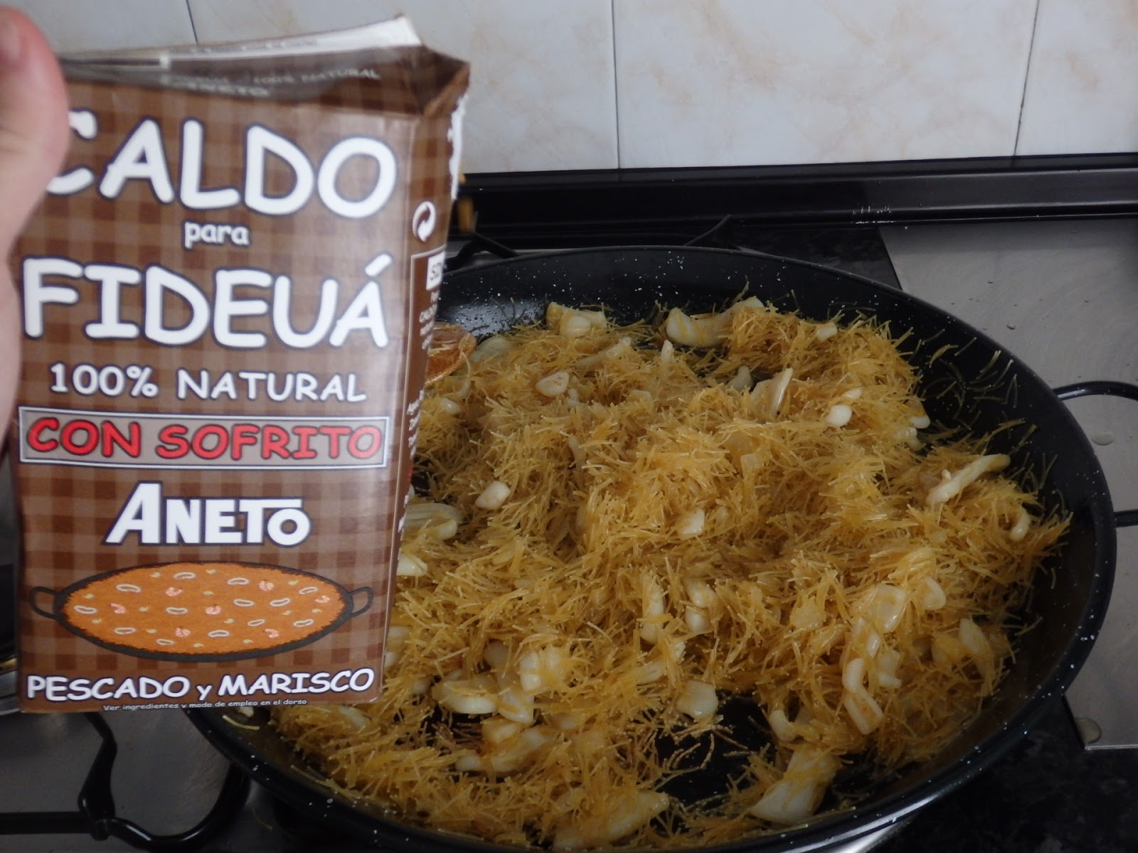 Y la Fideua con Calamares y Mejillones (con Caldo Aneto de Fideua con Sofrito) está lista...