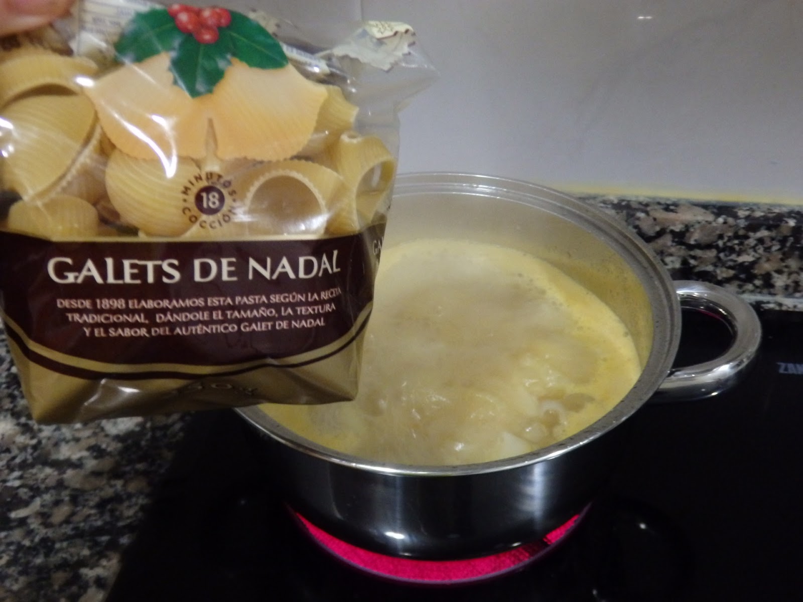 Añadir el caldo Aneto de Pescado y cuando empiece a hervir añadir los galets. Cocinar hasta que estén listos... Corregir de sal...