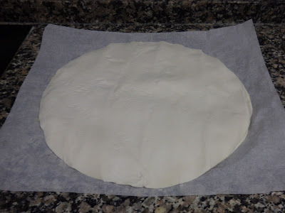 Extender una pasta de hojaldre y añadir la crema de avellanas y almendras... Cubrir con la otra pasta de hojaldre y cerrar los bordes con ayuda de un tenedor...