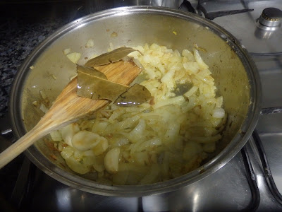 Add the garlic and the bay leaf... When all is fried, remove the bay leaf and triturate...